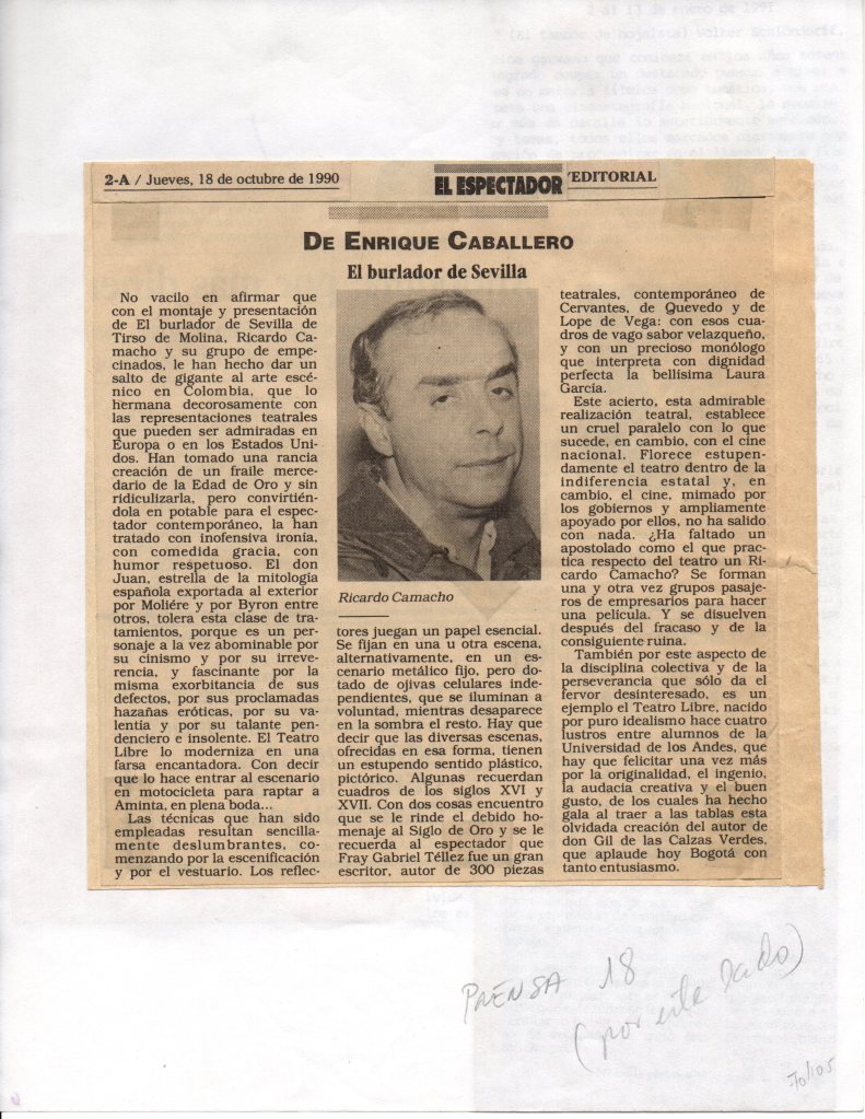 Ricardo Camacho, además de ser fundador del Teatro Libre y haber dirigido más de cien obras de teatro en toda su vida, ha formado y dirigido a actores como Consuelo Luzardo, Andrés Parra, Fernando Solórzano, Héctor Bayona, César Mora o Laura García, entre otros. Después de varios acercamientos en los ensayos de dos de sus obras y acompañamientos en sus clases de actuación, la pregunta es necesaria: